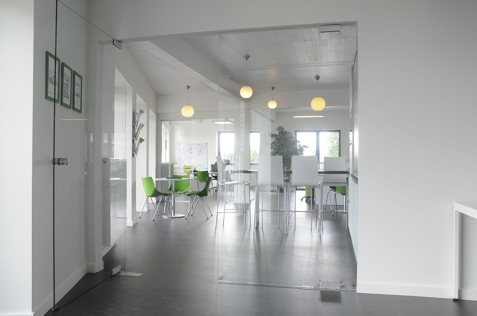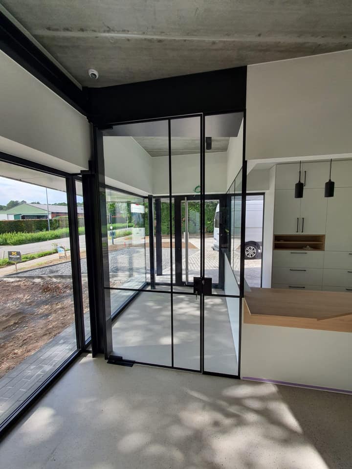 Mooie realisatie van glazen wanden met deuren in het nieuwe kantorencomplex van Confederatie Bouw Oost-Vlaanderen en Accuria. -