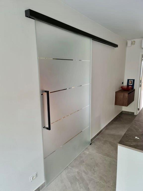 Schuifdeur met zwarte rail, deurgreep en zandstraling -