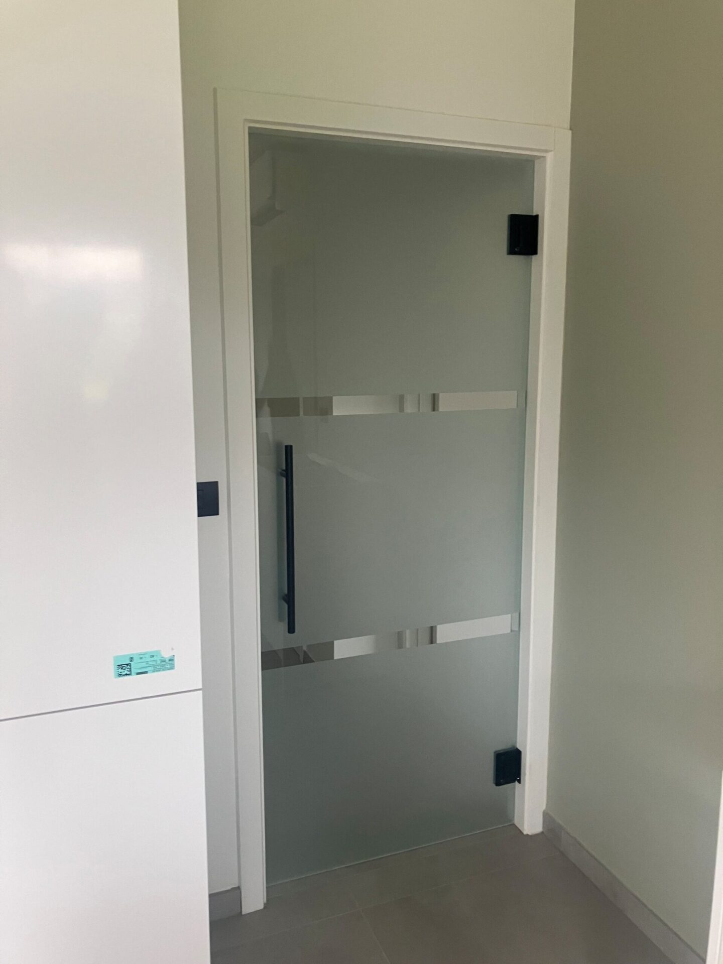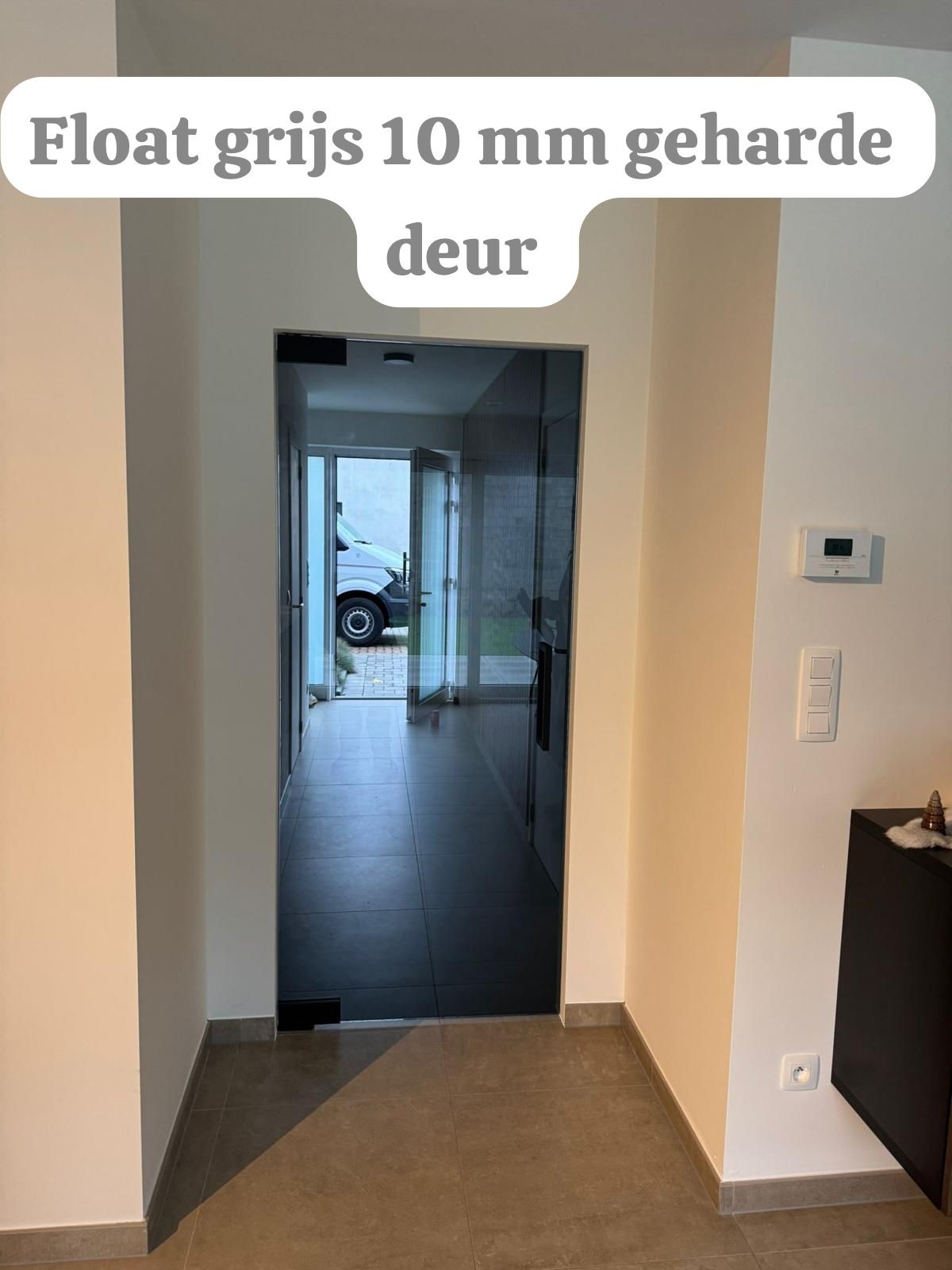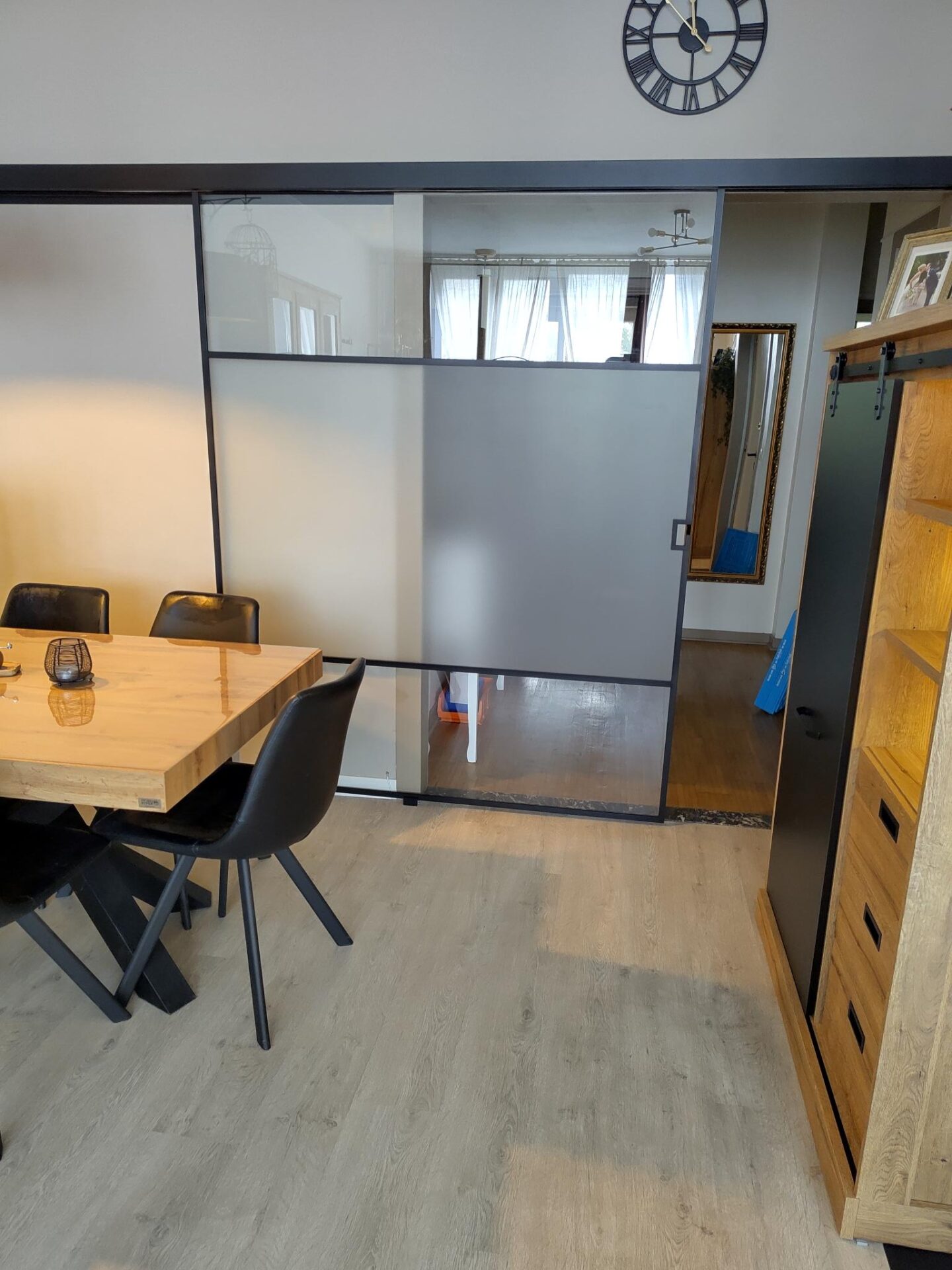 Schuifdeur met vast paneel in deuropening acide glas met open G greep open toestand -