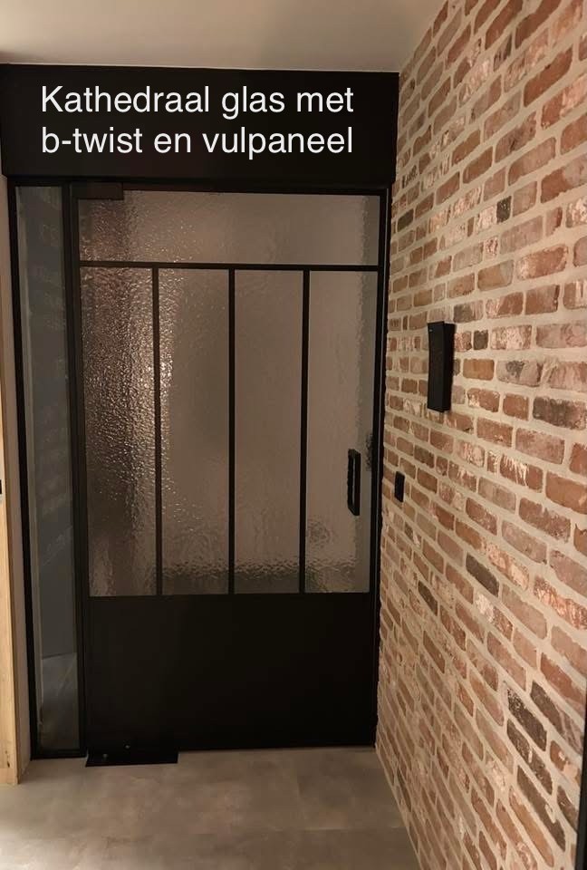 Deur in kathedraal glas met B-twist systeem, steellook met plaat onderaan -